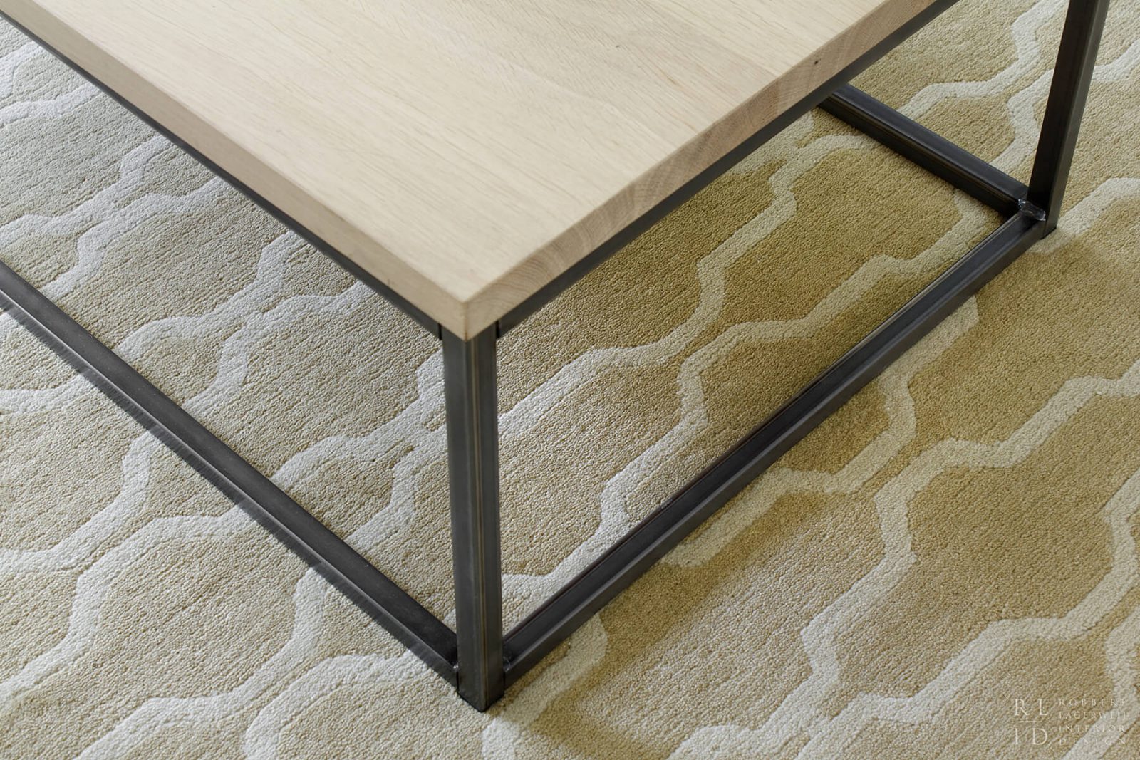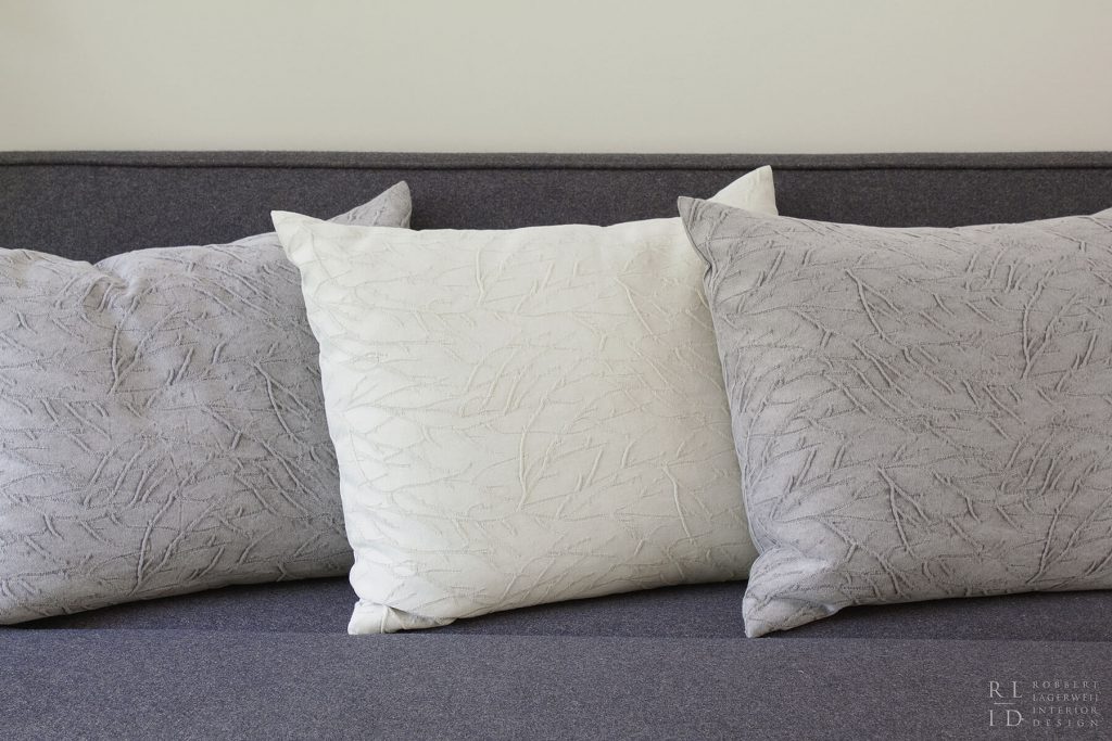 Farrow & Ball paint, Elephant’s Breath color for the walls, coarse woven silk curtain fabric for James Hare lampshades. Cushions from RL-ID. Rug from ICE. Various lighting such as the oak cove lamp with spotlights in the kitchen to its own RL-ID design. Wallpaper from the British Cole & Son.