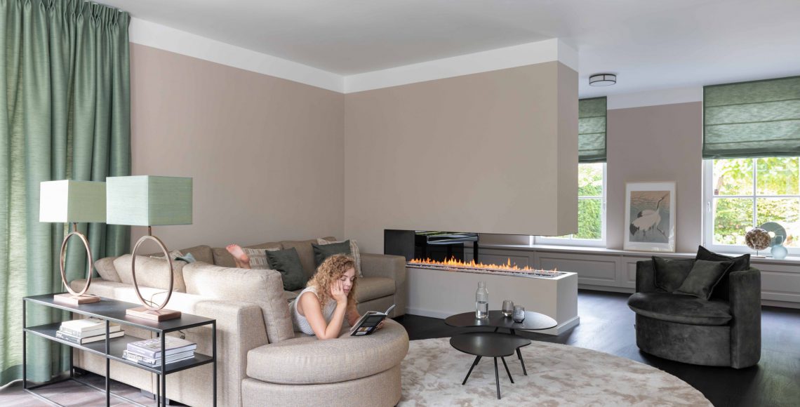 Het keuken-, en woonkamerdesign heeft een klassiek tijdloze en luxe uitstraling gekregen. Door de combinatie van het zwart stenen aanrechtblad en de in de muurkleur uitgevoerde fronten/keukenkastdeuren en lades met het solide brons/koperen beslag, is er een spannende combinatie ontstaan. De boven keukenkastjes met klassieke geruite glazen deurtjes boven het aanrechtblad met verlichting geven extra opbergruimte en lichten het werkblad uit.